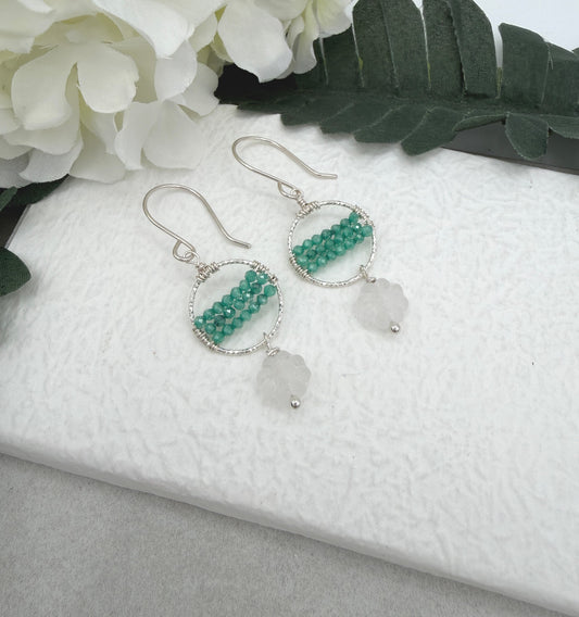 Earrings with Wire Wrapped Sea Foam Cubic Zirconia, Diamond Cut Loops and Frosted Flowers CHE-510