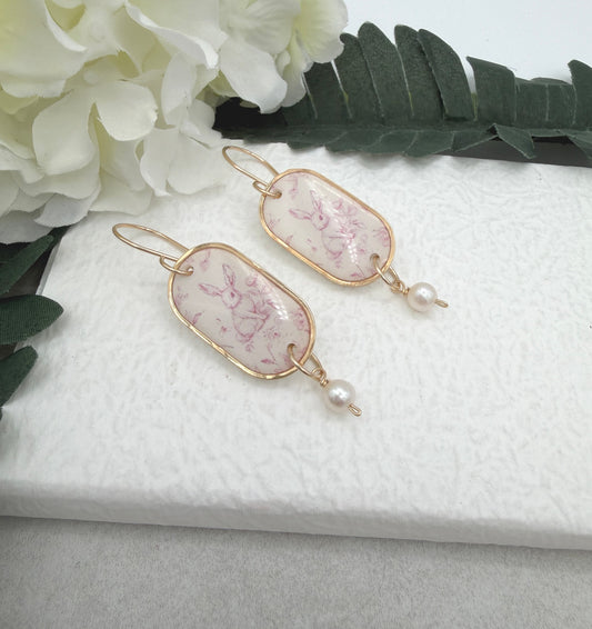 Earrings Made with Polymer Clay Pink Toille Bunnies and Pearl Drops - PCE-982