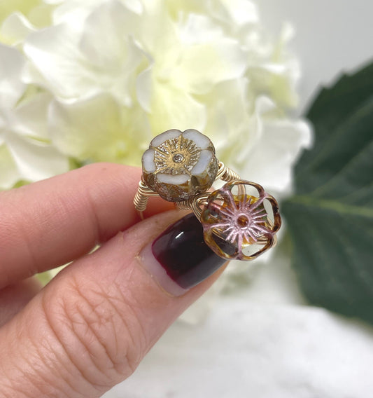 14k Gold Filled Wire Wrapped Ring with a Rose Colored or Cream Colored, Czech Glass Flower GR-16