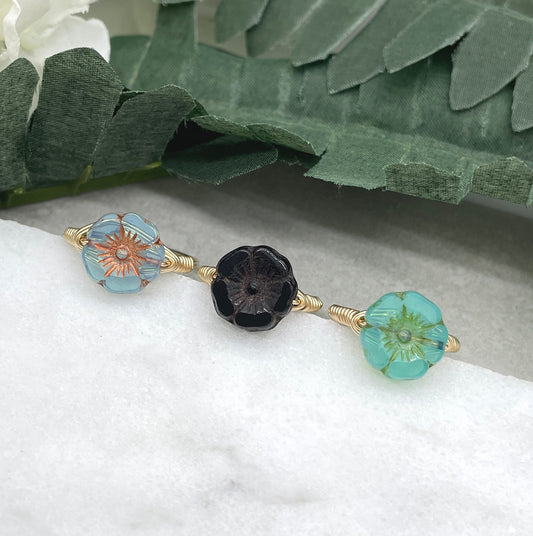 14k Gold Filled Wire Wrapped Ring with a Blue, Black or Green Colored, Czech Glass Flower GR-17