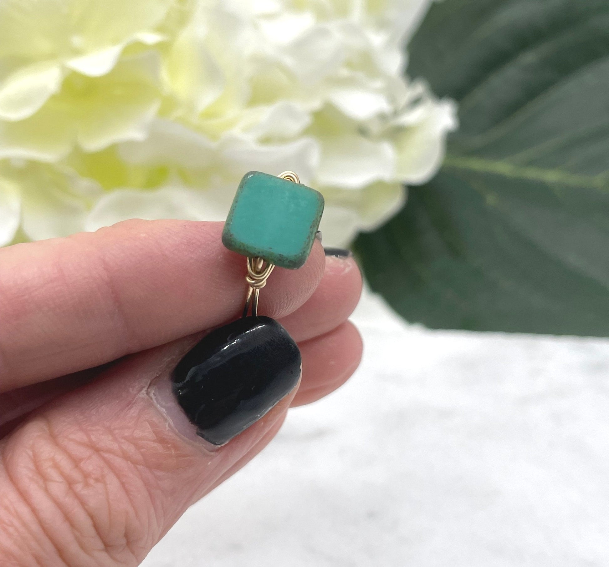 This ring is made by wire wrapping 14k gold filled wire around a single, flat, square, blue green, Czech glass bead. Please indicate the size you would like.