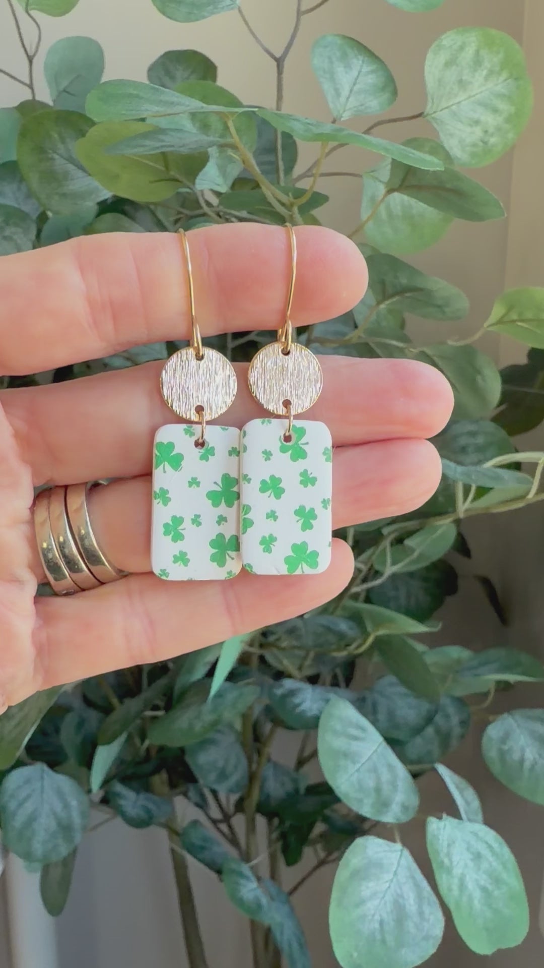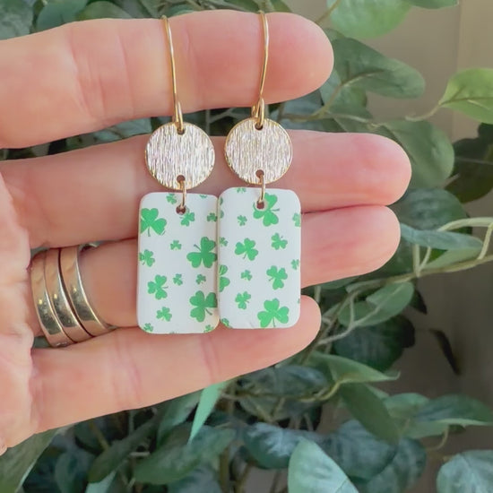 Earrings made with a white Polymer Clay shaped into rectangles with a green clover design and gold plated circles. The earring wires are handmade using 14k gold filled wire. They measure 2 1/4 inches long and 1/2 inch wide.