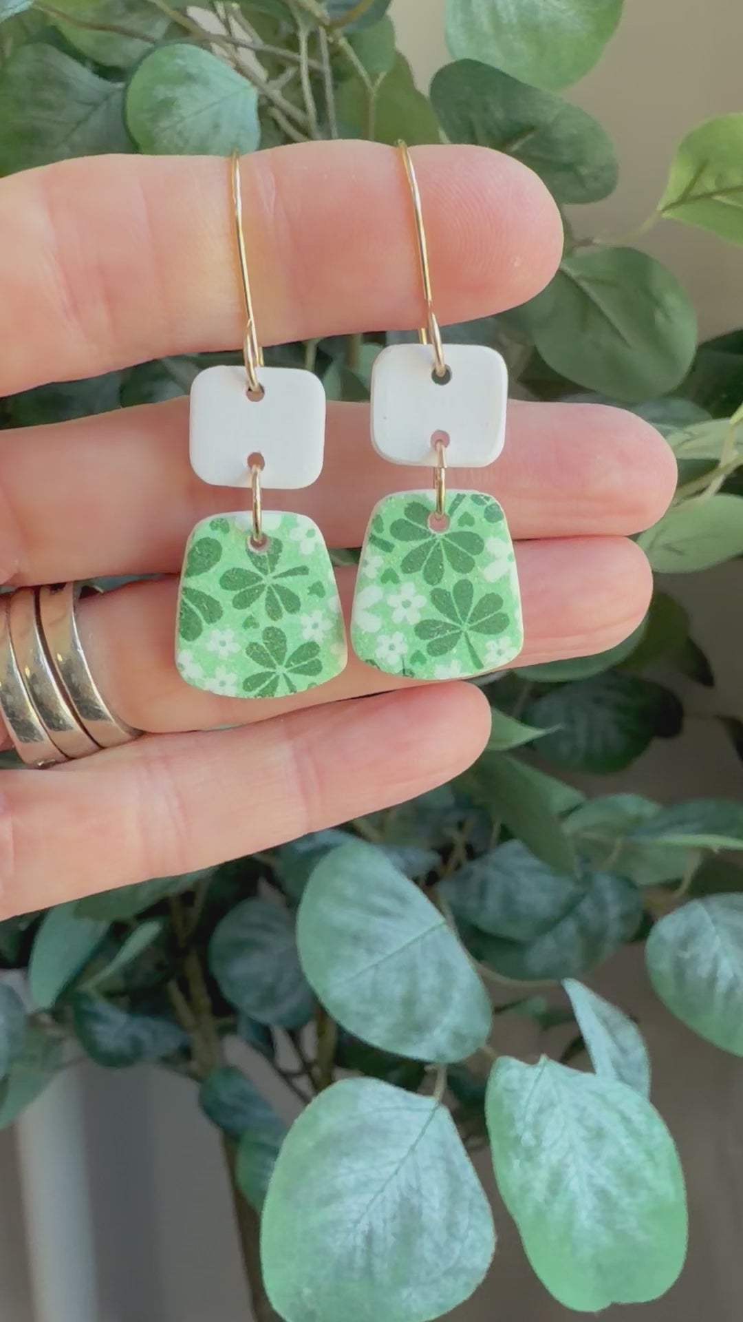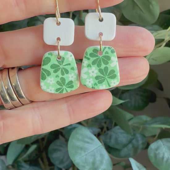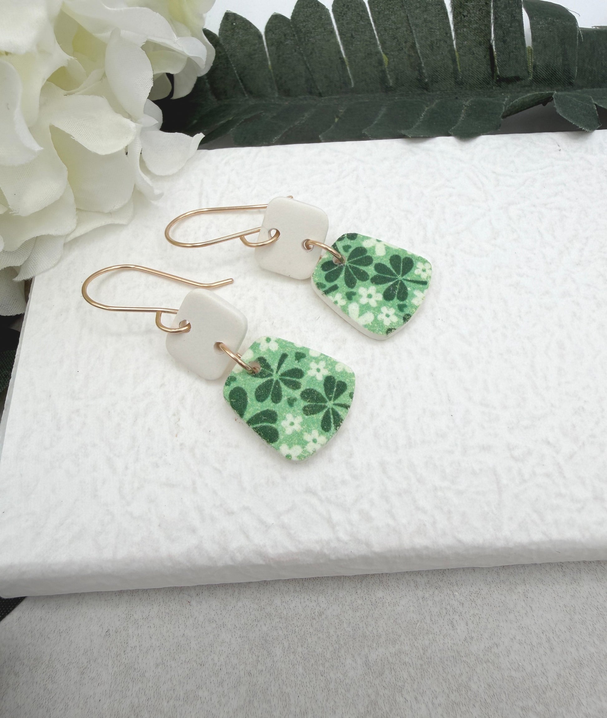 Earrings made with a white Polymer Clay shaped into squares and trapezoids with a green clover design. The earring wires are handmade using 14k gold filled wire. They measure 2 inches long and 1/2 inch wide.